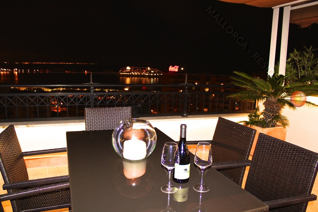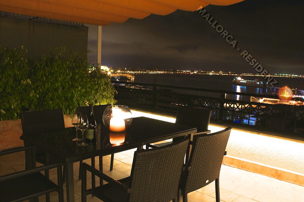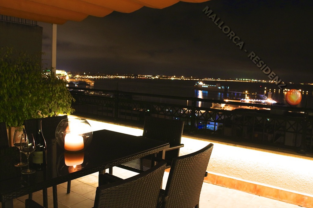 In der zweiten Etage erwartet Sie eine ca. 70 qm grosse Dachterrasse mit fantastischem Meerblick auf die gesamte Bucht von Palma. Geniessen Sie den Sonnenuntergang