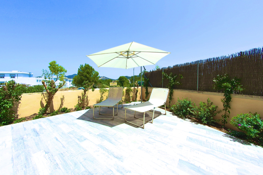 Terrasse mit gemütlichen Gartenmöbeln und direktem Zugang zum Pool.