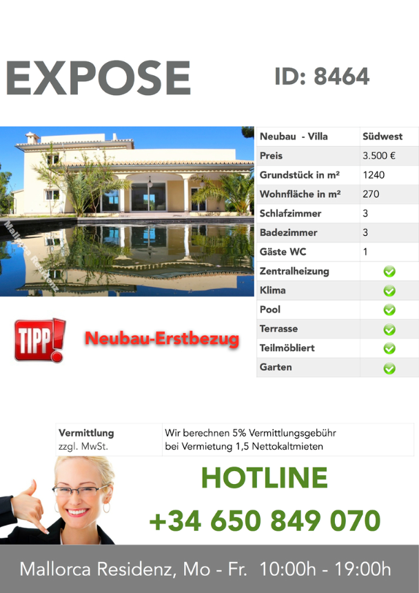 möbliert, unmöbliert, Klima, Zentralheizung, Pool, Sat-TV, Terrasse, Garage, Stellplatz, Garten, Küche mit Komplettausstattung, Amerikanische Küche, Waschküche, Isolierverglasung, Abstellraum, DSL,