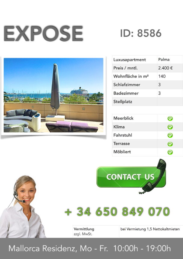 möbliert mit italienischen Designermöbeln, Klima, Heizung, See- / Meerblick, Fahrstuhl, Sat-TV, Terrasse, Yachtnähe, Küche mit Komplettausstattung, Amerikanische Küche, Waschküche, Isolierverglasung, DSL, Alarm