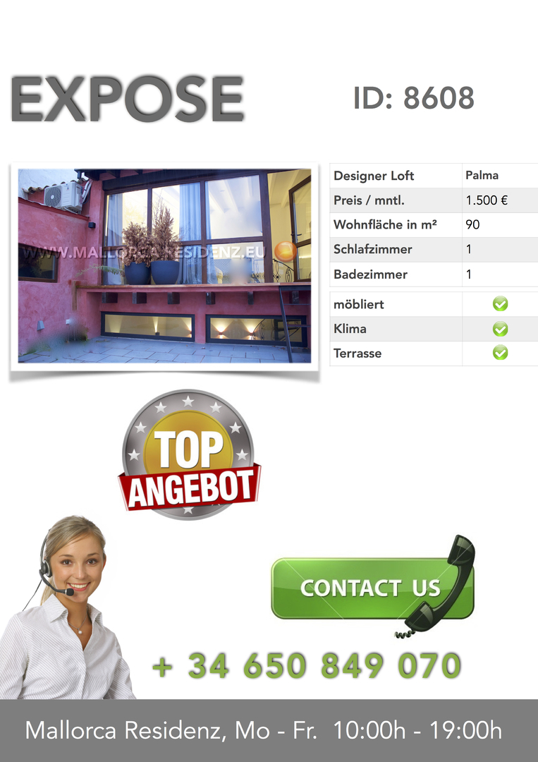 Duplex mit 90 qm Wohnfläche. Schlafzimmer mit 40 qm Terrasse in der oberen Etage. Die Terrasse verfügt über eine Aussendusche und einen grosszügigen