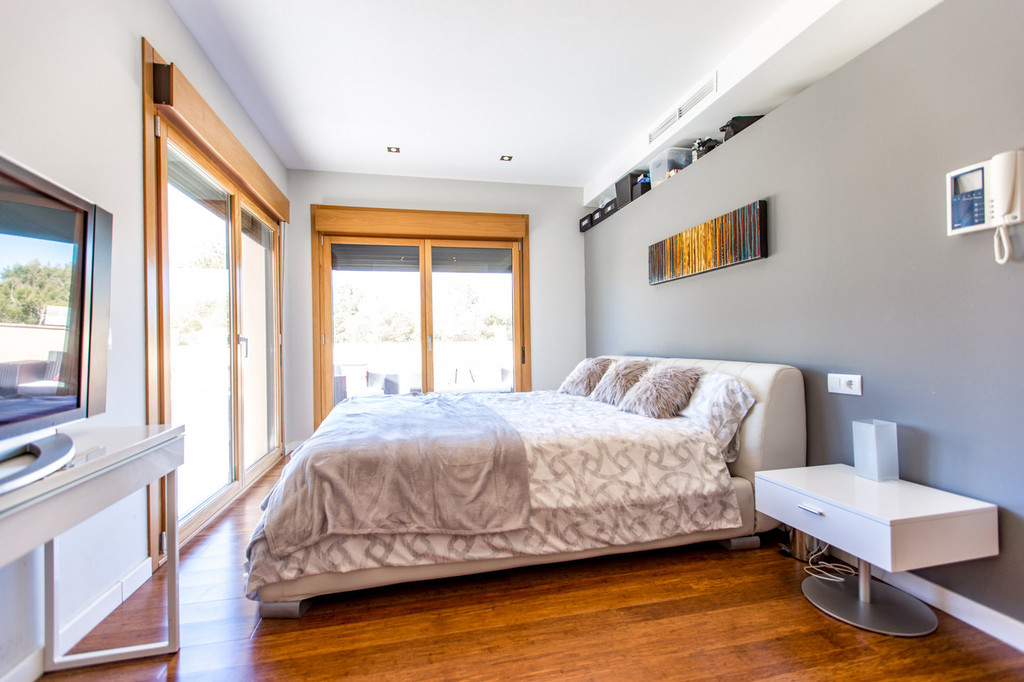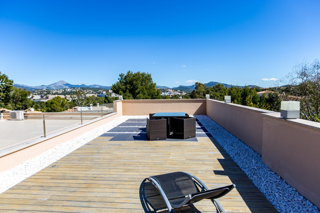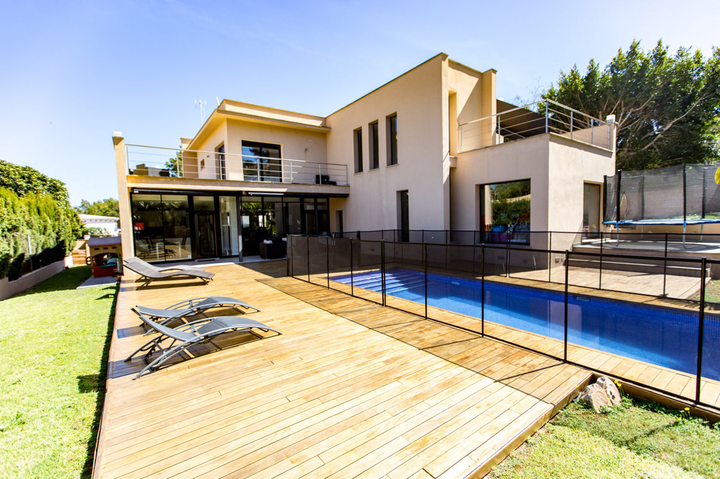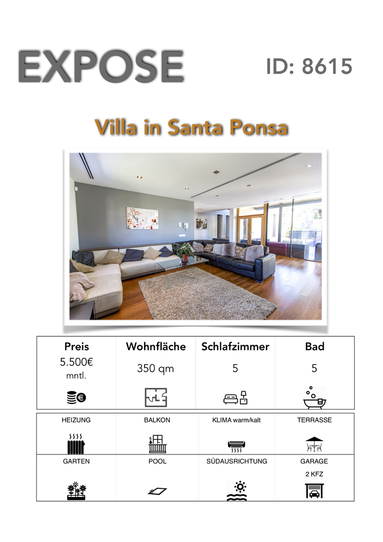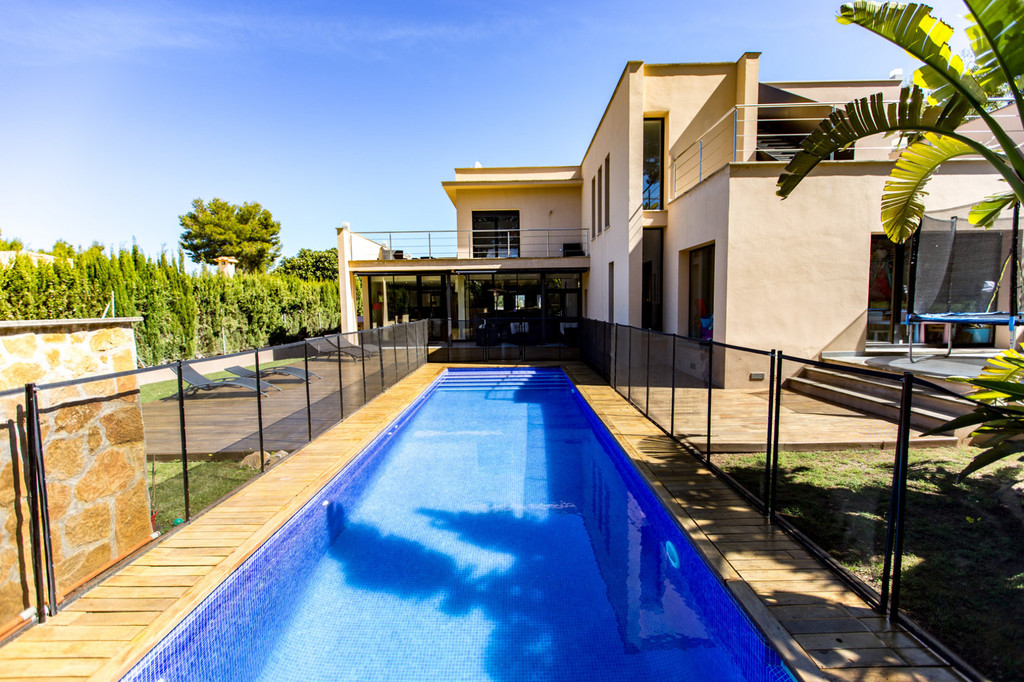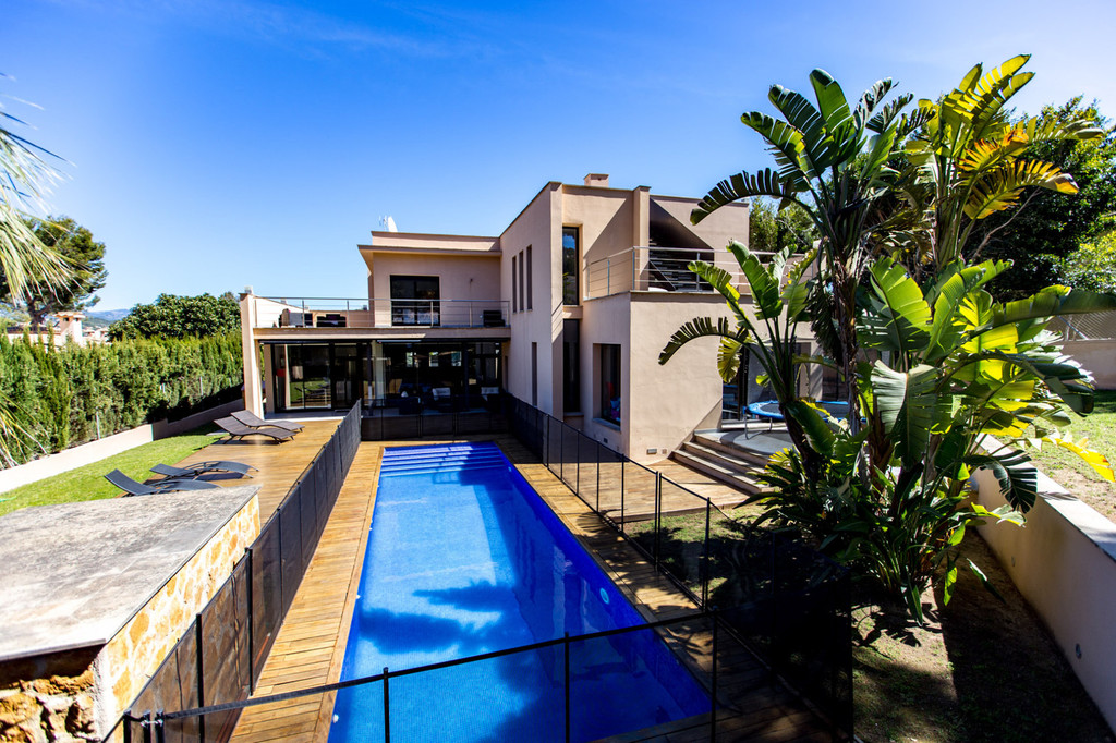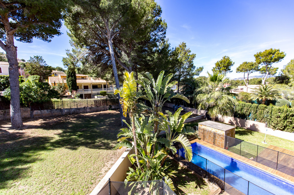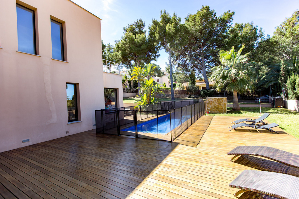 Moderne Villa in einer ruhigen Gegend von Santa Ponsa mit Blick auf Berge und Grünzonen. Das Haus liegt nur 5 Minuten von Port Adriano, den Golfplätzen und nur 18 km von Palma entfernt. Im Untergeschoss befindet sich der Eingangsflur, der die Etage in 3 Bereiche teilt: Rechts vom Eingang liegt das Wohn-Esszimmer mit Zugang zu einer hübschen Veranda, die an den Garten mit Pool grenzt. Neben dem Wohn-Esszimmer liegt die moblierte Küche und die Waschküche. Links vom Eingang befinden sich die Garage für 2 Autos. Gegenüber liegen 3 Schlafzimmer und 3 Badezimmer. Auf der ersten Etage befindet sich das Hauptschlafzimmer mit Ankleideraum, Badezimmer en Suite und Zugang zu einer großen Terrasse. Auf der anderen Seite befindet sich eine Bar mit Kinoraum für Partys und ein Schlafzimmer mit Bad für Gäste mit Zugang zu einer Terrasse.
