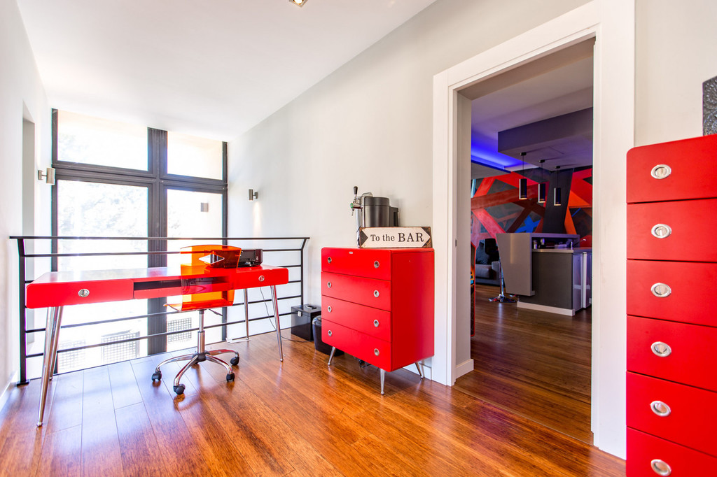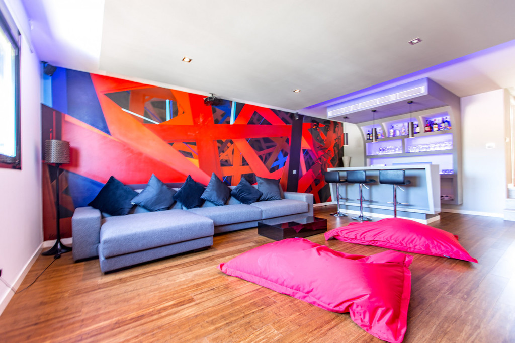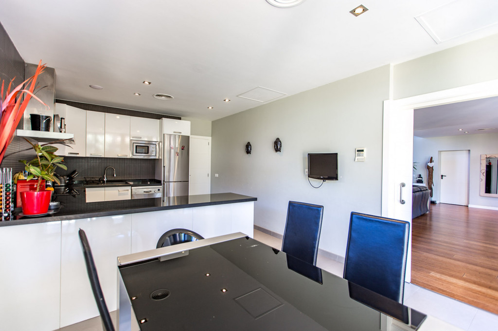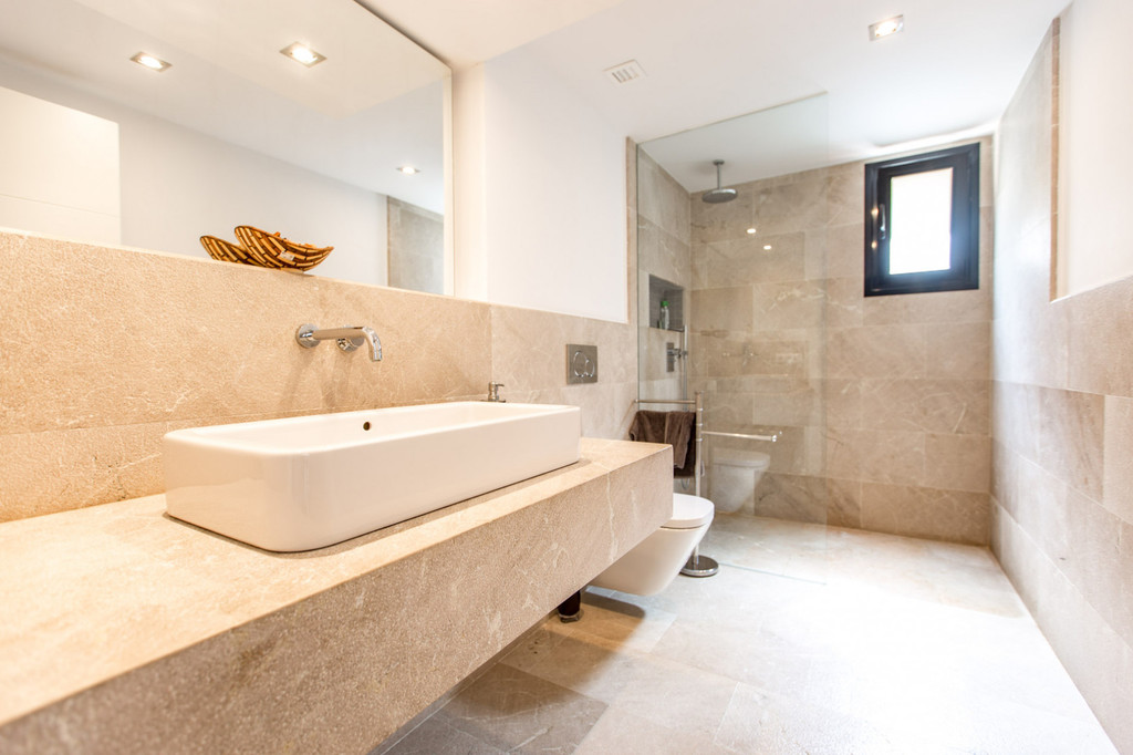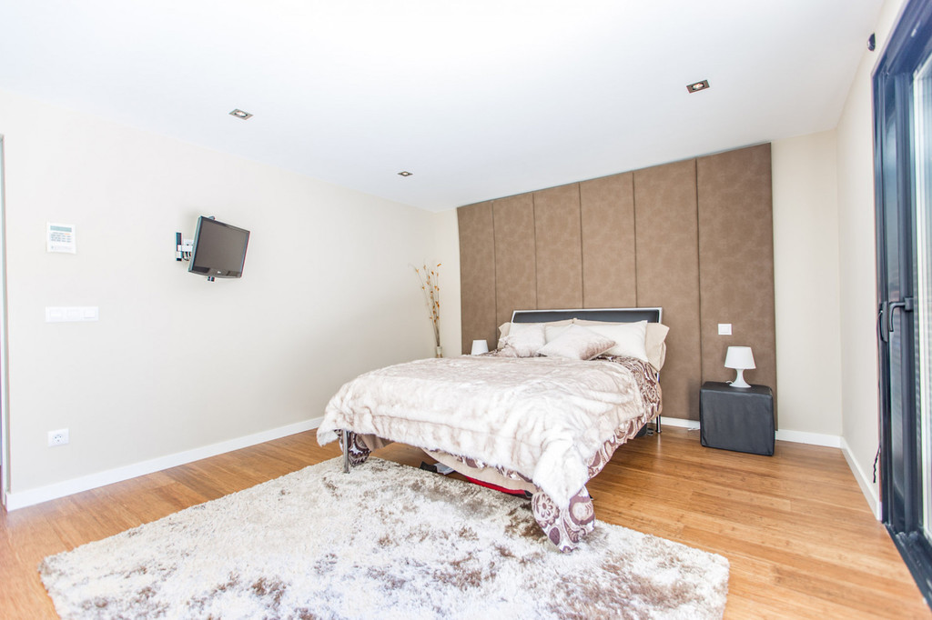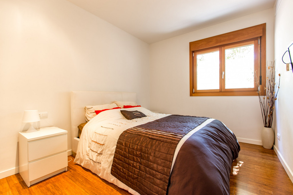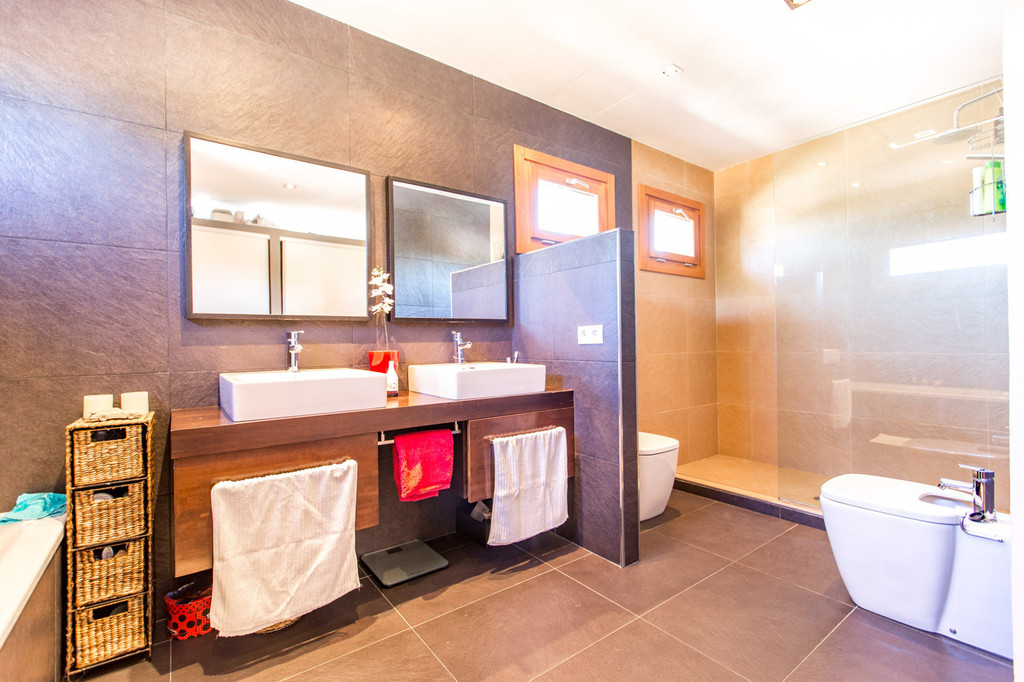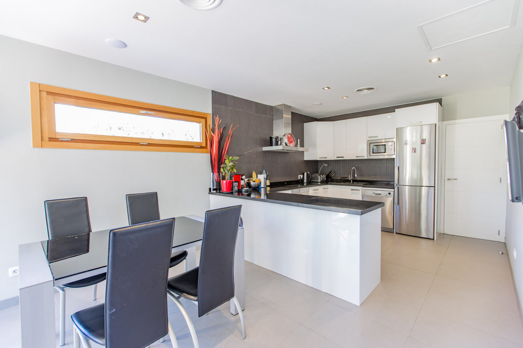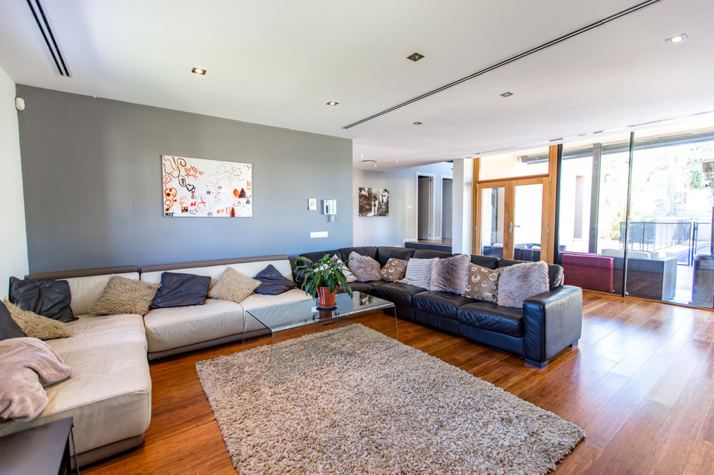Moderne Villa in einer ruhigen Gegend von Santa Ponsa mit Blick auf Berge und Grünzonen. Das Haus liegt nur 5 Minuten von Port Adriano, den Golfplätzen und nur 18 km von Palma entfernt. Im Untergeschoss befindet sich der Eingangsflur, der die Etage in 3 Bereiche teilt: Rechts vom Eingang liegt das Wohn-Esszimmer mit Zugang zu einer hübschen Veranda, die an den Garten mit Pool grenzt. Neben dem Wohn-Esszimmer liegt die moblierte Küche und die Waschküche. Links vom Eingang befinden sich die Garage für 2 Autos. Gegenüber liegen 3 Schlafzimmer und 3 Badezimmer. Auf der ersten Etage befindet sich das Hauptschlafzimmer mit Ankleideraum, Badezimmer en Suite und Zugang zu einer großen Terrasse. Auf der anderen Seite befindet sich eine Bar mit Kinoraum für Partys und ein Schlafzimmer mit Bad für Gäste mit Zugang zu einer Terrasse.